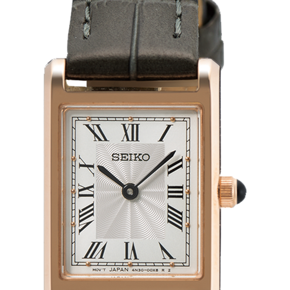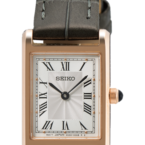 Reloj con correa gris y esfera rectangular. Con Calibre 4N30 este modelo de mujer es especial y único.