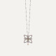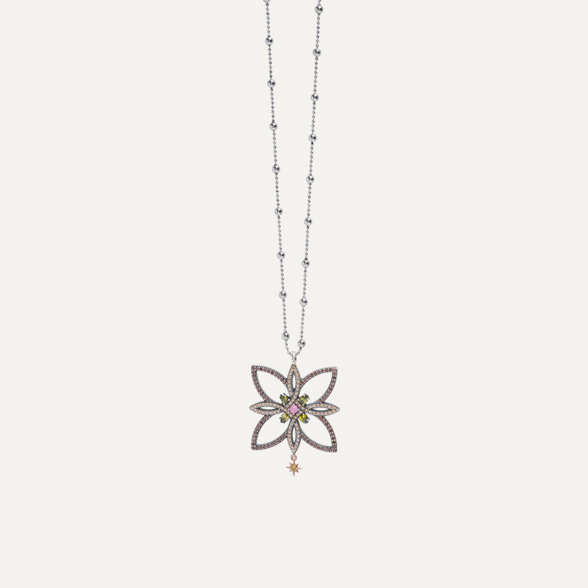 Colgante artesanal de plata con cadena de esferas y un colgante en forma de flor estilizada de seis pétalos. El centro está realzado con circonitas en color verde peridoto que aportan frescura y luminosidad, mientras que cada pétalo se perfila con un pavé de circonitas que intensifica el brillo. En la parte inferior, un pequeño colgante en forma de estrella engastado en tono cava añade movimiento y un acabado sofisticado. Una joya hecha a mano en España, ideal para mujeres que buscan un diseño exclusivo, elegante y lleno de simbolismo natural.