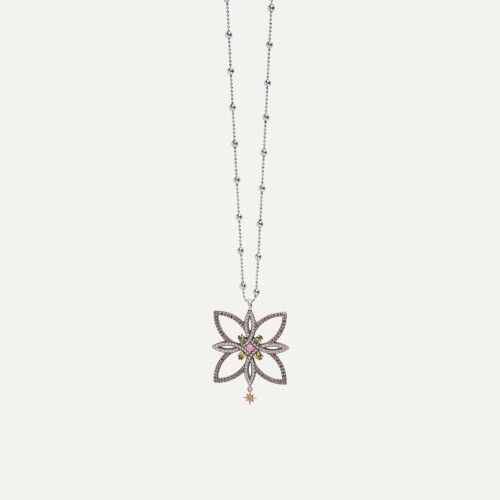 Colgante de plata con diseño floral, circonitas combianadas cava, peridoto verde y brown, y cabujón central en rosa.