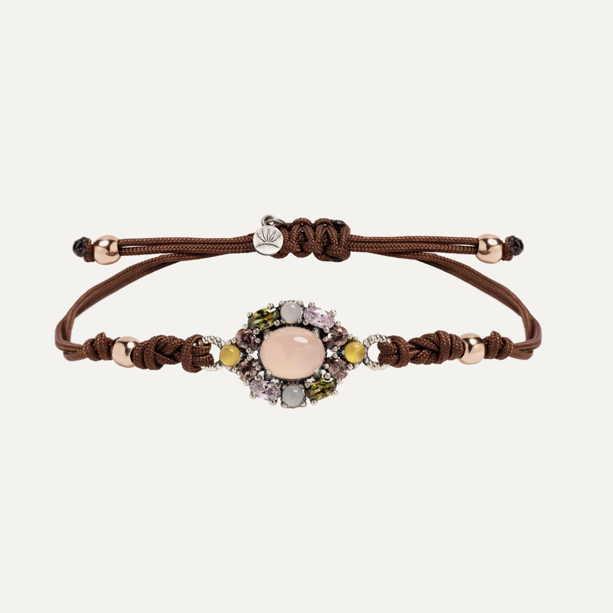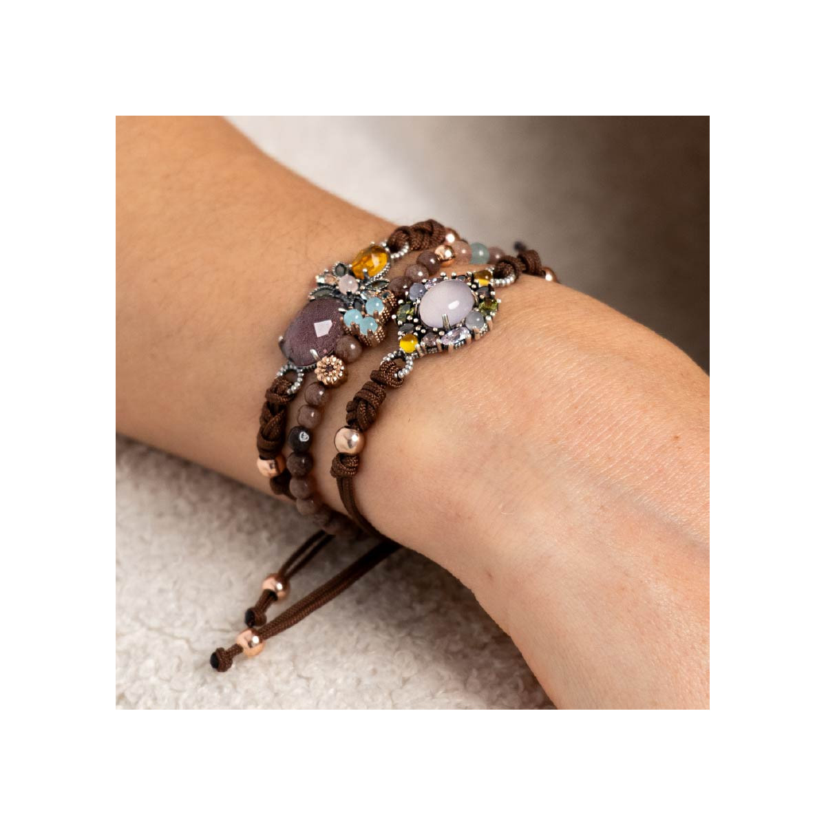 Pulsera de macramé marrón con lazada marinera, disponible con cuarzo rosa o turmalina central y piedras multicolor combinadas.