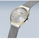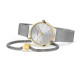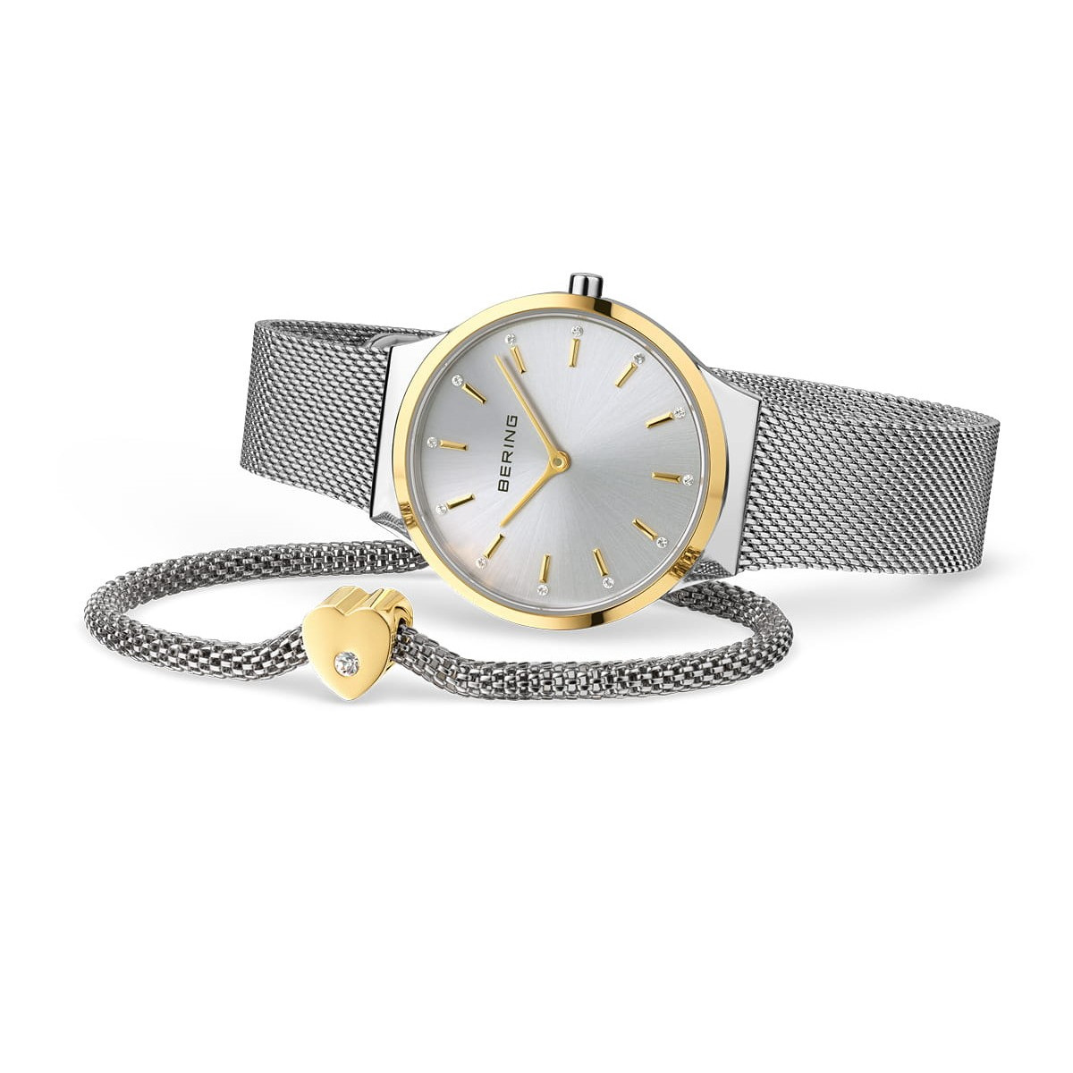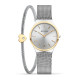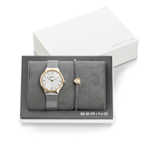 Este elegante set combina dos piezas perfectamente armonizadas: un sofisticado reloj de mujer BERING y una pulsera a juego. En el centro del diseño destaca la caja ovalada de acero inoxidable con un acabado de alto brillo, realzada por un bisel dorado que aporta un contraste sutil pero refinado. La esfera plateada con efecto rayos de sol refleja la luz con matices suaves y se complementa a la perfección con los índices y las agujas doradas.