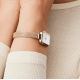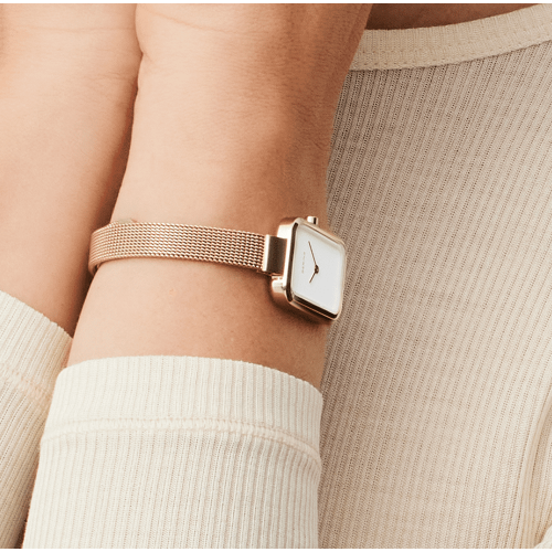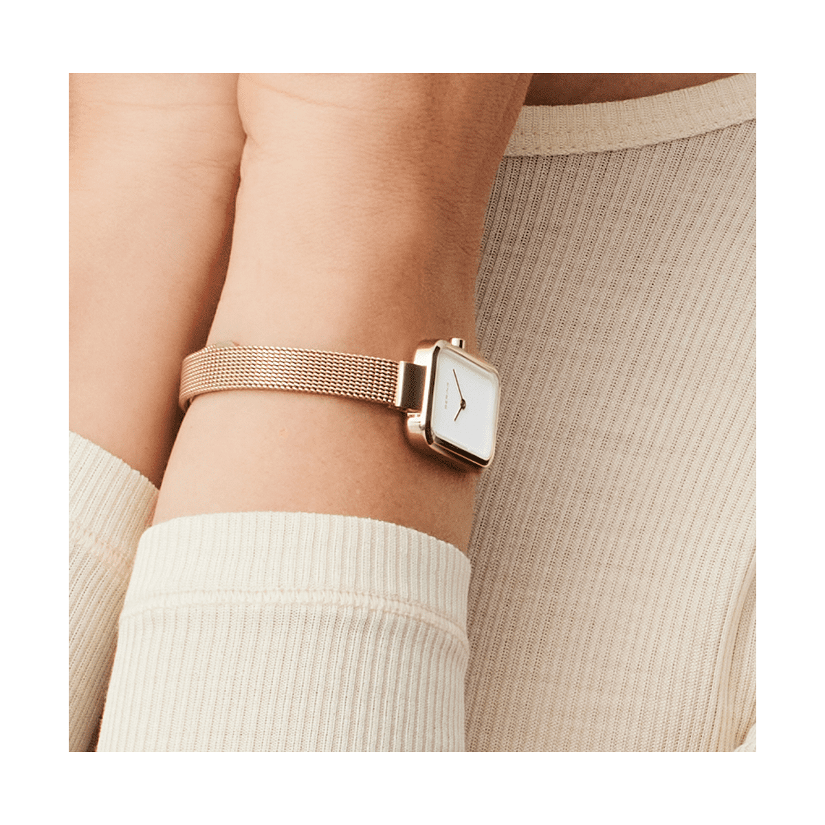 La esfera blanca se mantiene deliberadamente pura: sin índices, sin distracciones, solo dos agujas doradas que se deslizan con ligereza sobre una superficie serena. El resultado es una estética atemporal que sigue fielmente el estilo escandinavo: clara, reducida y segura de sí misma. La forma rectangular aporta un aire arquitectónico al reloj, perfectamente resaltado por la caja plana de acero inoxidable pulido y cepillado.