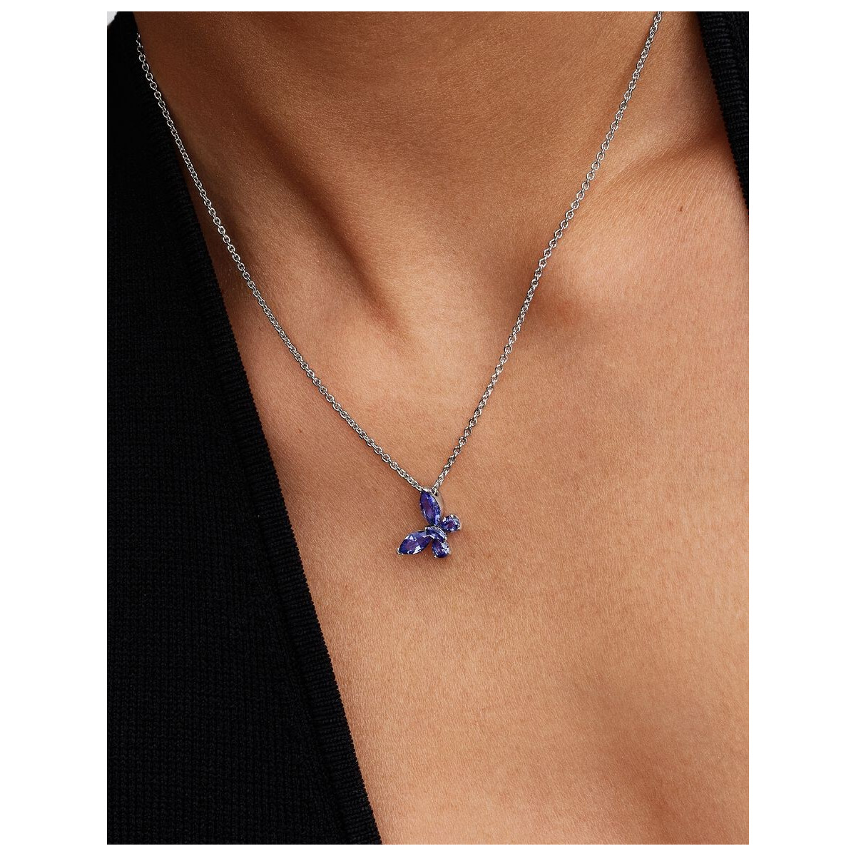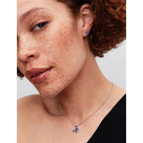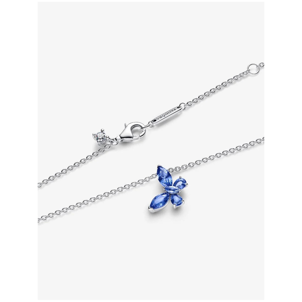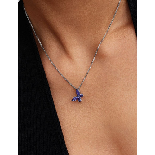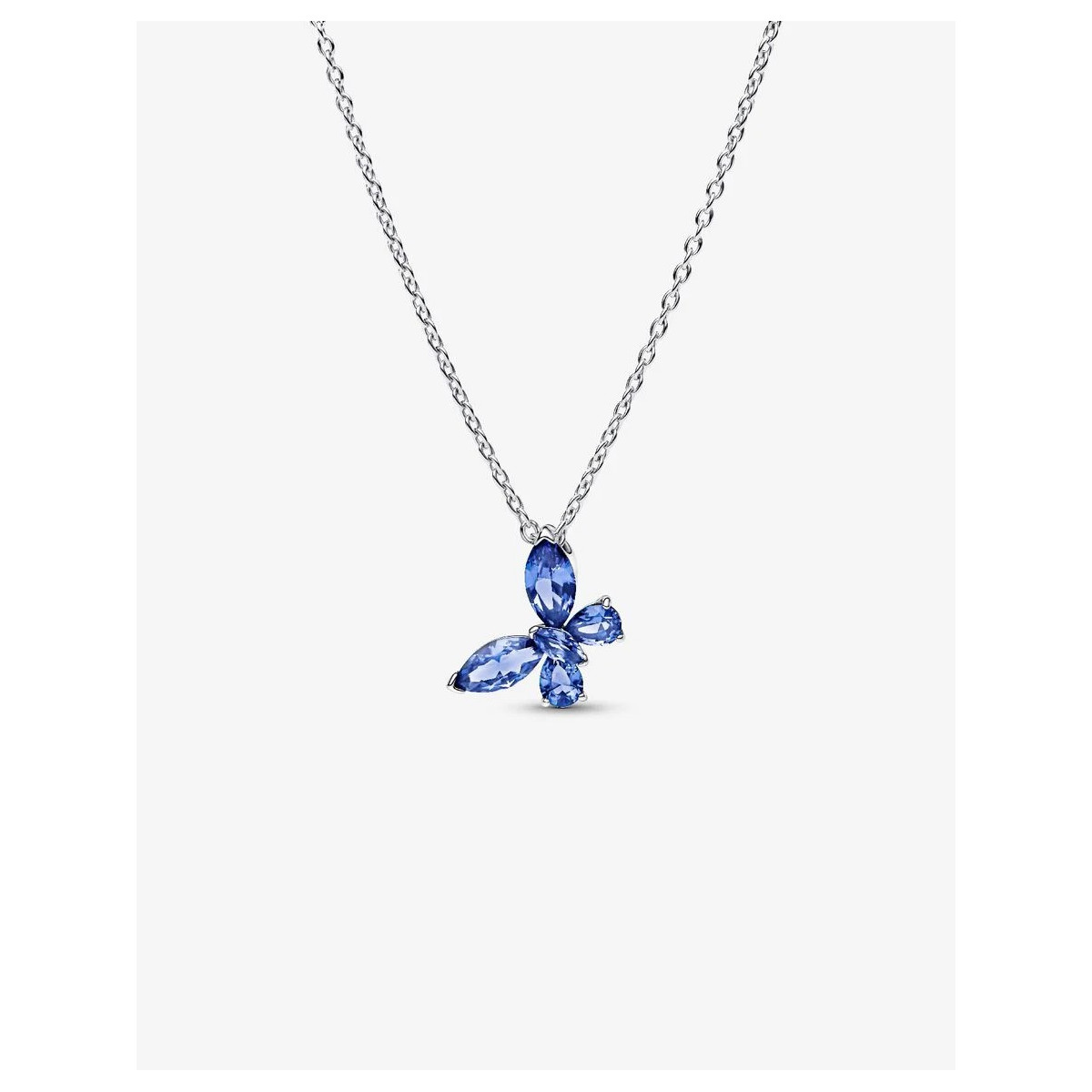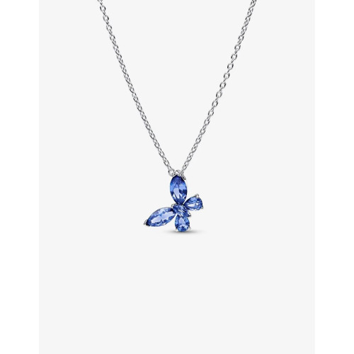 Extiende tus alas y transforma tu look con este collar en plata de primera ley. Adornado con cristales sintéticos de color azul con talla marquesa y forma de pera, una mariposa cuelga graciosamente de su cadena.