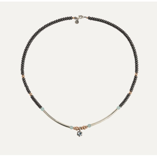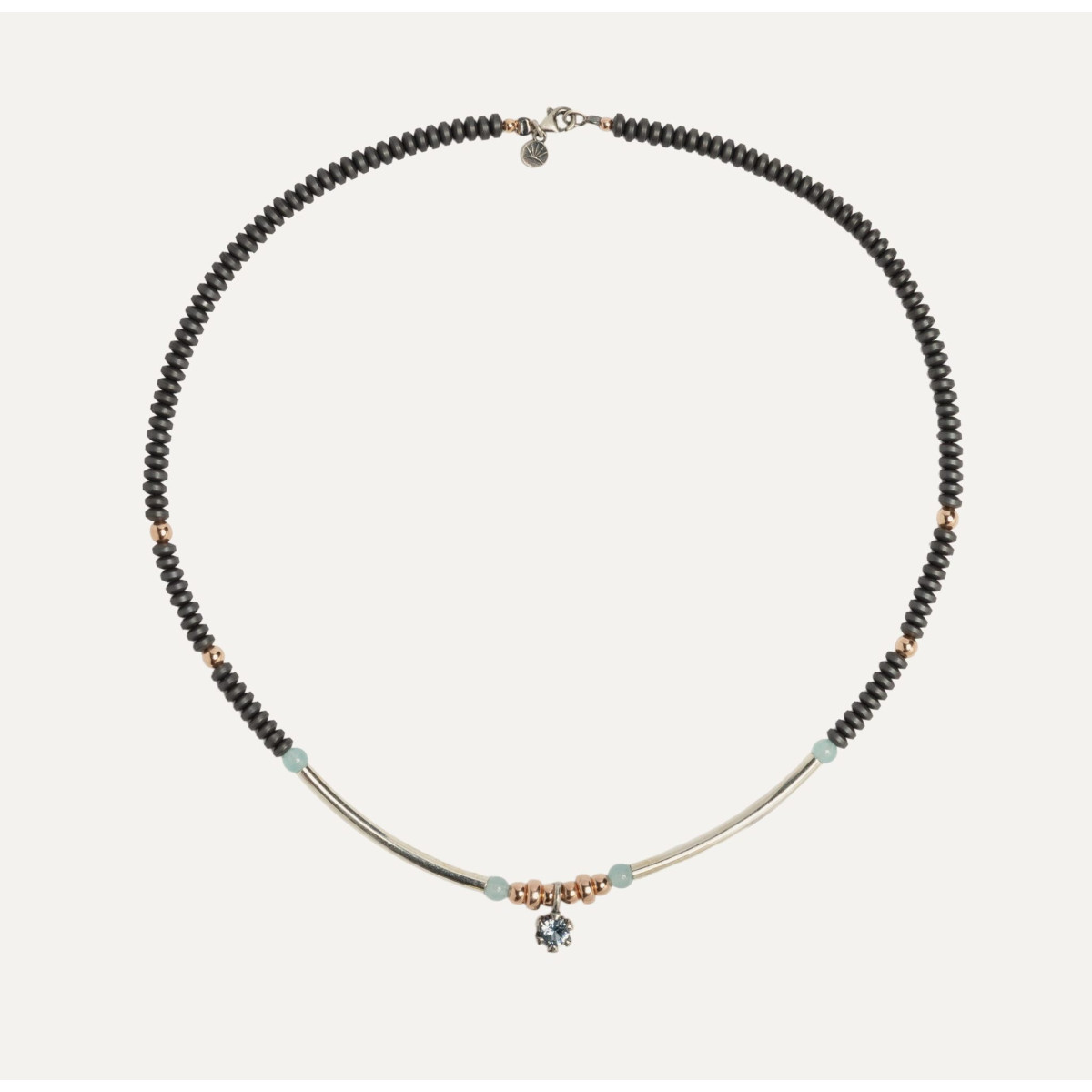 Colección de collares artesanales con cuentas en tono gris mate y rosado, cada uno realzado con una circonita en talla plano ovalada circonita azul y aguamarina . Diseños exclusivos hechos a mano en España, que combinan modernidad, elegancia y un brillo sutil para aportar distinción a cualquier estilo.