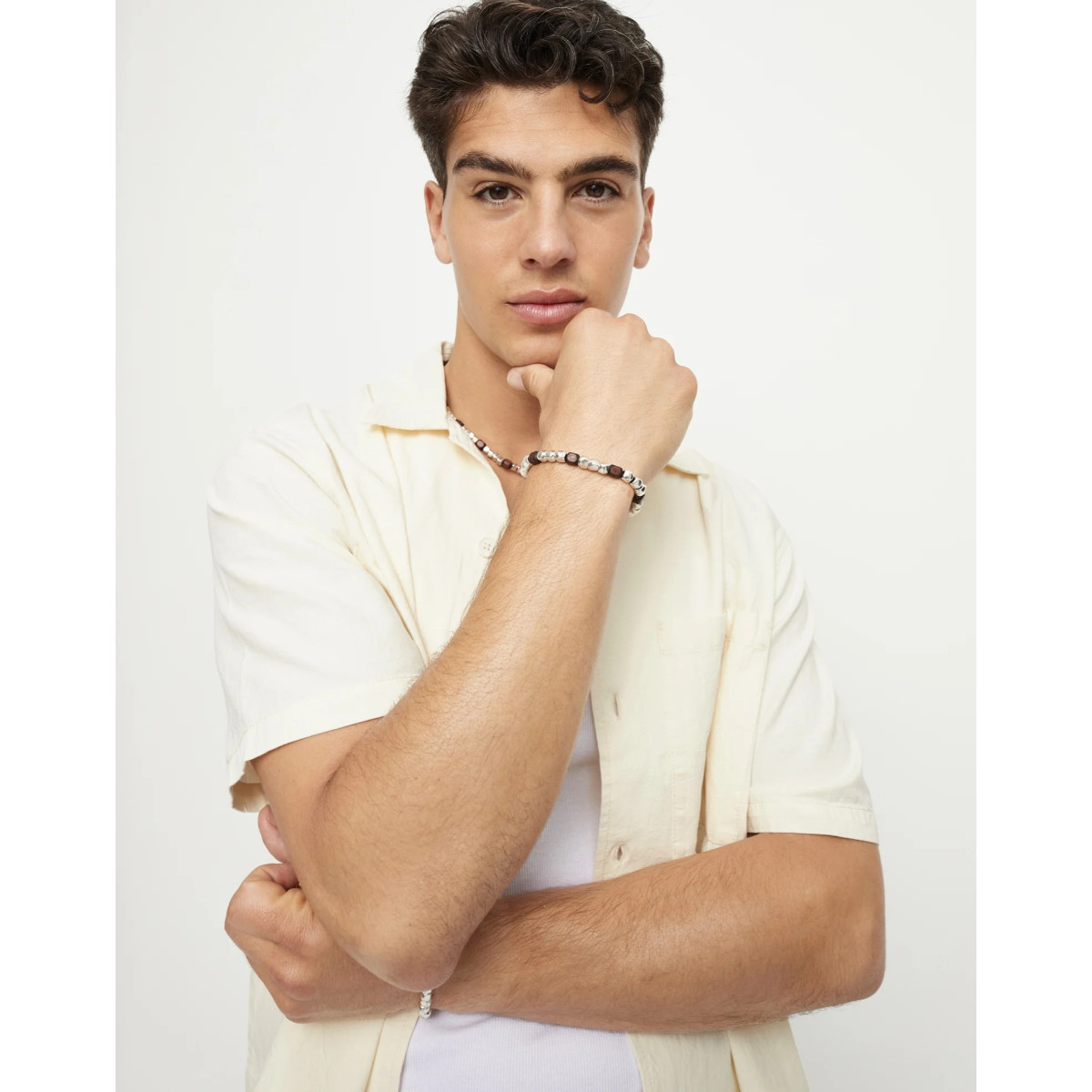 Pulsera elástica con cuentas bañadas en plata y madera. Naturaleza y diseño en perfecta sintonía. Esta pulsera elástica combina cuentas metálicas de forma orgánica bañadas en plata con detalles en madera natural, creando un contraste cálido y auténtico que eleva cualquier look con un aire artesanal y moderno. Hecha a mano en España, es una pieza versátil que transmite equilibrio, ideal para quienes buscan joyas con alma.