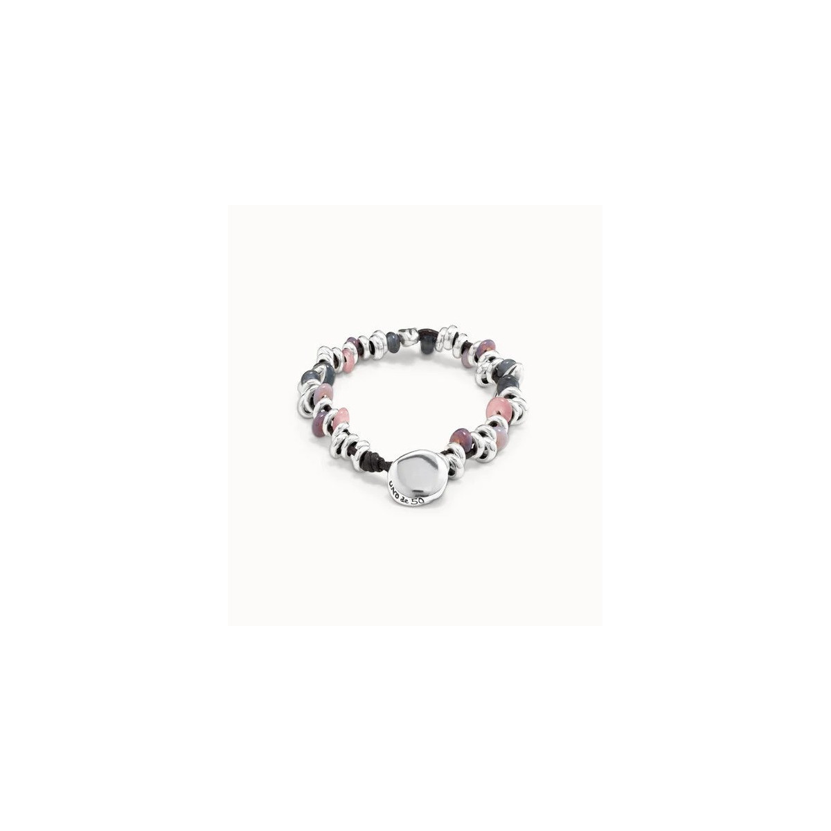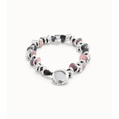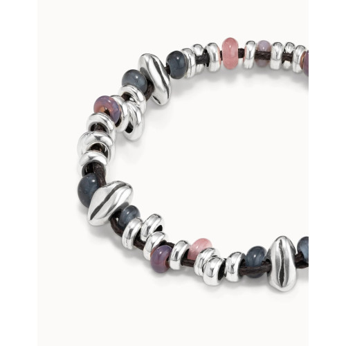 Pulsera diseñada en cuero con piezas bañadas en plata de diversos tamaños inspiradas en granos de trigo y cristales artesanales tintados de manera natural. Una creación de estilo desenfadado elaborada bajo un cuidadoso proceso artesanal. Hecha totalmente en España y original de UNOde50.